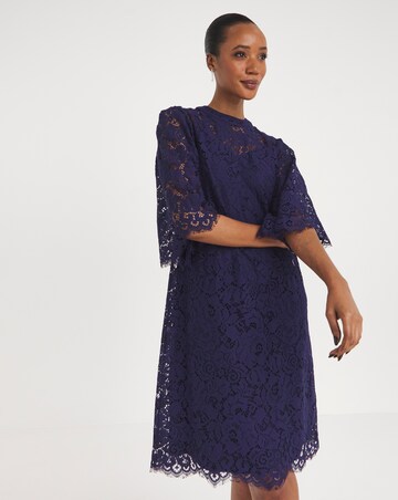 In a timeless navy, this lace embroidered dress is the perfect show stopper that will suit all body types due to the relaxed fit. Complete with a concealed zip closure in the ...