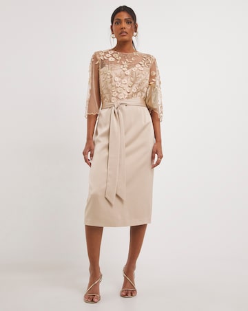 In a timeless blush colour, our mesh contrast dress features matching floral embroidery on a breathable mesh fabric base. Complete with a contrast crepe skirt with a removable...